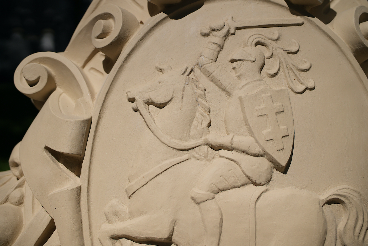 Rzeźba przedstawiająca herb Czartoryskich wywodzący się od herbu Pogoń litewska (herb Wielkiego Księstwa Litewskiego) stoi w jednym z boków głównego placu, nieopodal rzeźby kobiety z dzbanem. Przypomina o dawnych właścicielach parku i jego dobrodziejach.